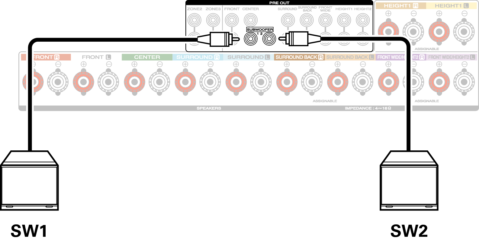 El nivel y la distancia se pueden ajustar por separado para el subwoofer 1 y el subwoofer 2.
