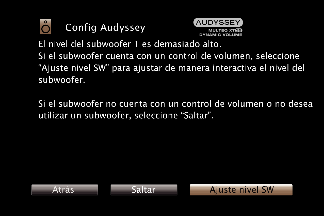 Durante la medición del nivel del subwoofer, se muestra un mensaje de error cuando un nivel de los subwoofers está fuera del intervalo de 72 – 78 dB.