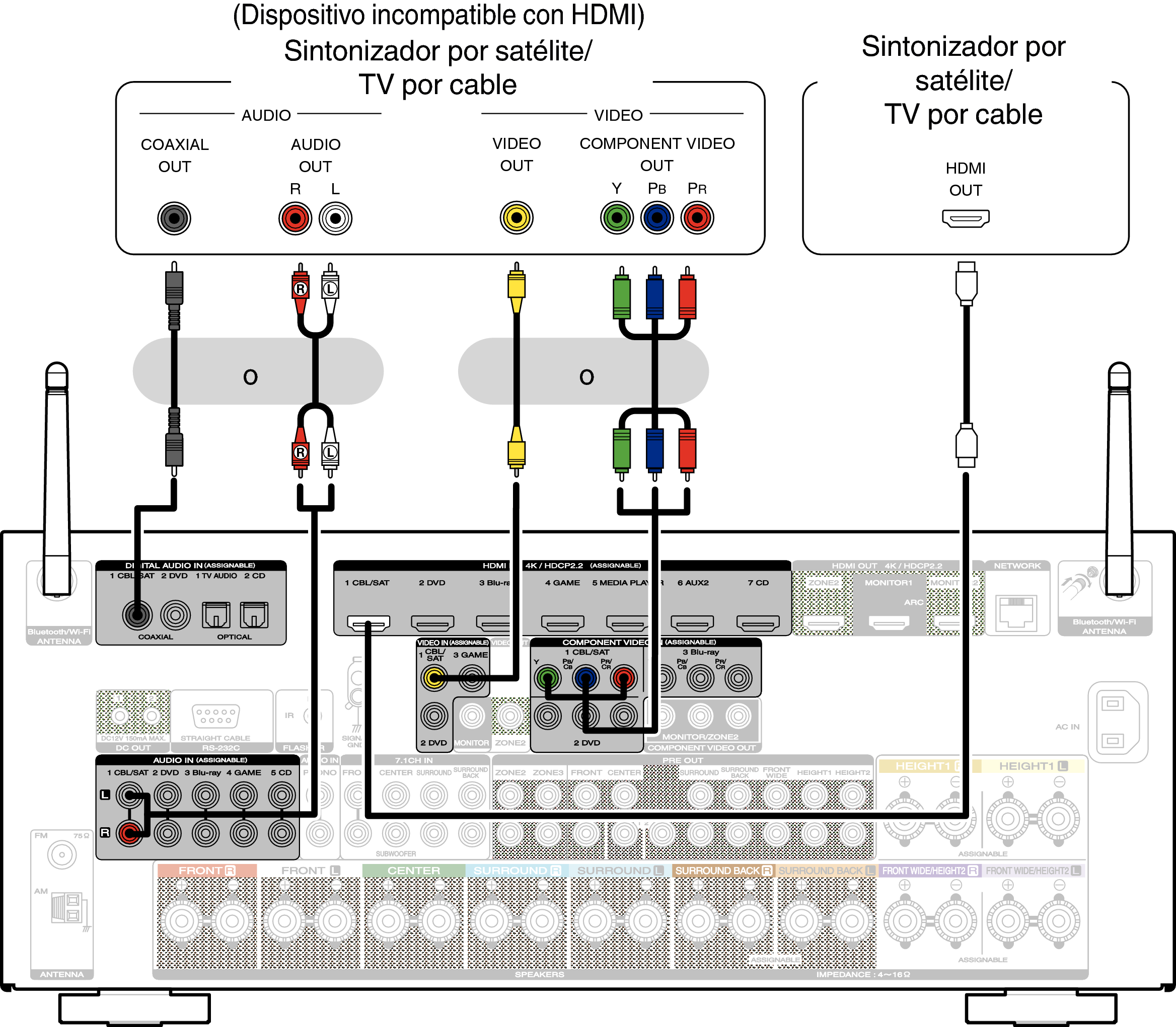 En esta explicación se incluye la conexión con un sintonizador de TV por satelite/por cable como ejemplo.