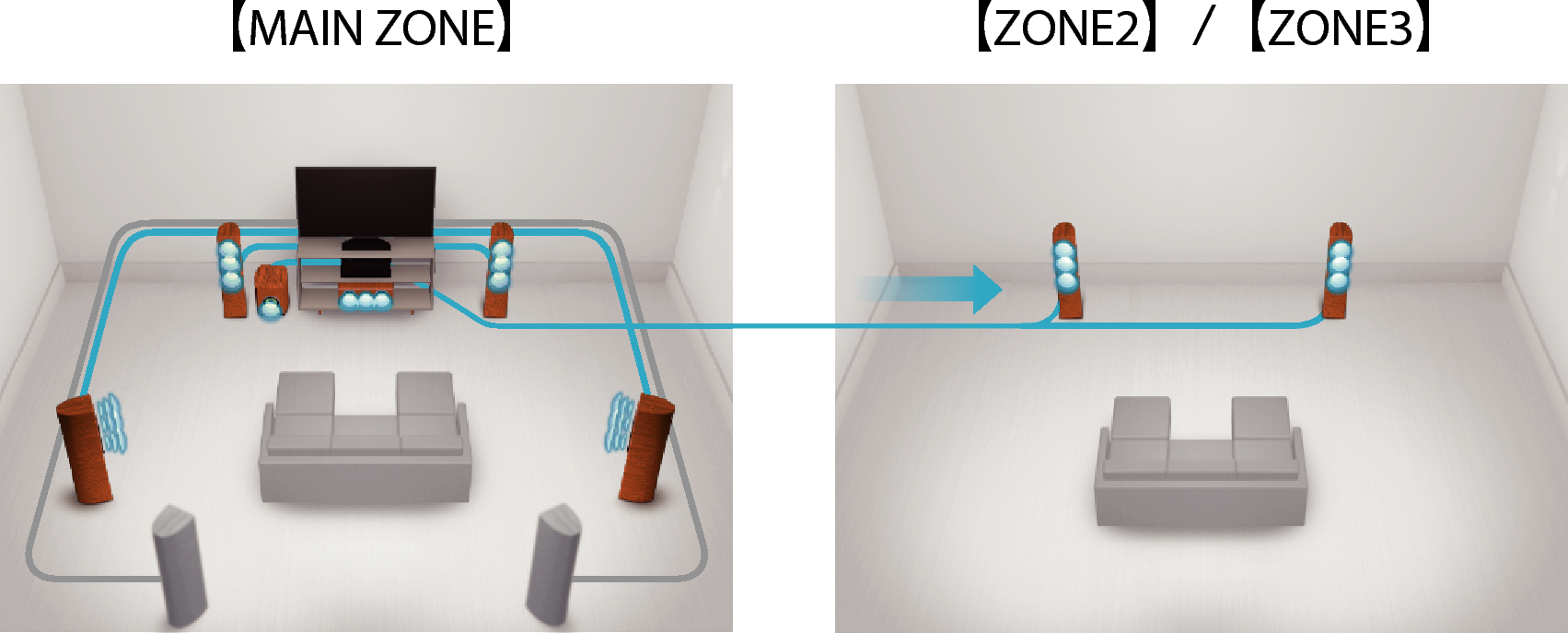 La salida multi-sala ZONE2 incluye una salida HDMI que le permite disfrutar de una fuente A/V diferente en esa sala, con la reproducción de otro programa en la sala principal.