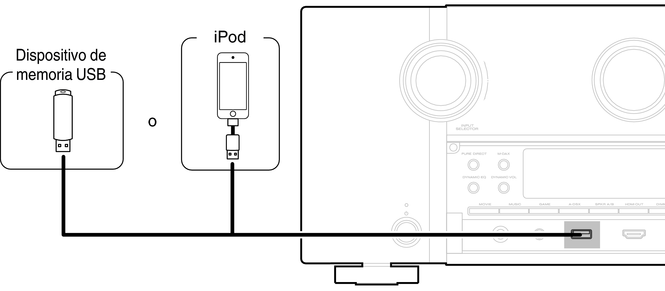 Consulte las instrucciones de funcionamiento en “Reproducción desde un iPod” enlace o “Reproducción desde un dispositivo de memoria USB” enlace.