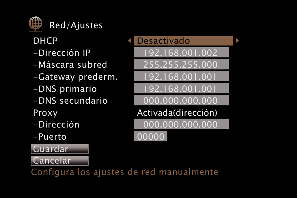 Si está utilizando un router de banda ancha (función DHCP), la información necesaria para la conexión a la red, como la dirección IP, será configurada automáticamente ya que la función DHCP está ajustada en “Activado” en la configuración de esta unidad.