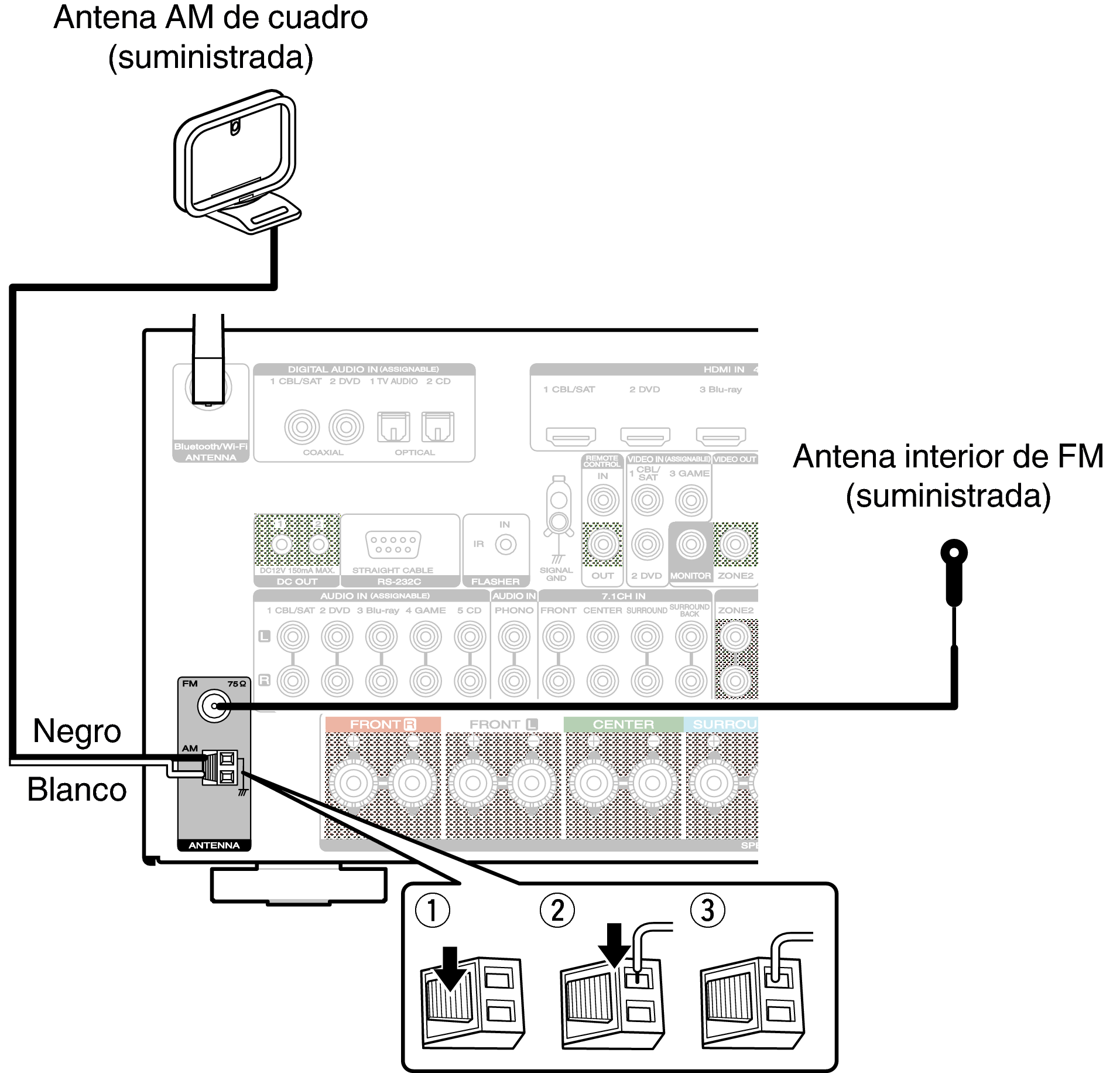 Asegúrese de que los terminales del conductor de la antena AM de cuadro no queden en contacto con las partes metálicas del panel.