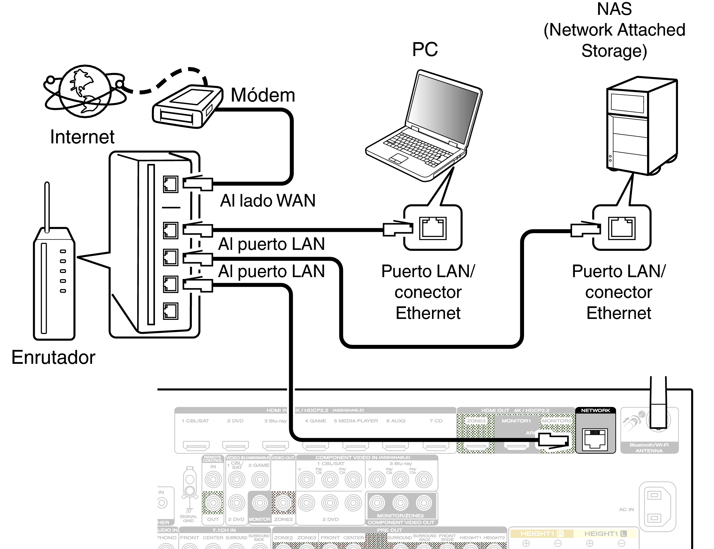 Para realizar conexiones a través de una LAN con cable, utilice un cable LAN para conectar el router a esta unidad como se muestra en la figura debajo.